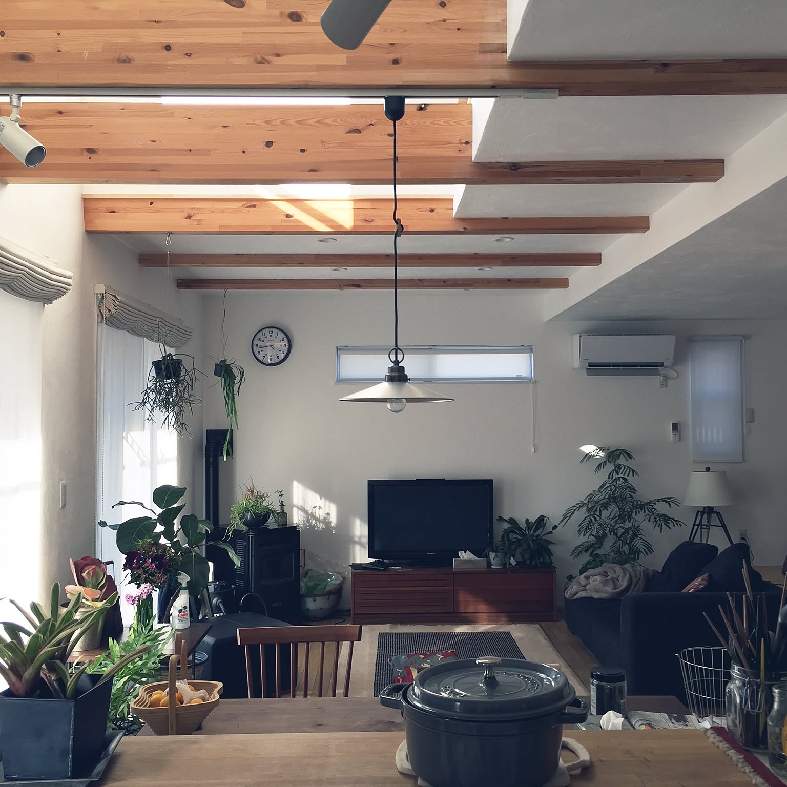 こなれ感バツグンのインダストリアルなリビング。ここには、高級感のある3灯ライトが設置されています。このセレクトはとっても◎。お部屋がラフになりすぎないよう、ライトがさりげなく、けれどしっかりと締めてくれています。ユーザーさんのトータルコーディネート力の高さがひと目で分かる実例です。
