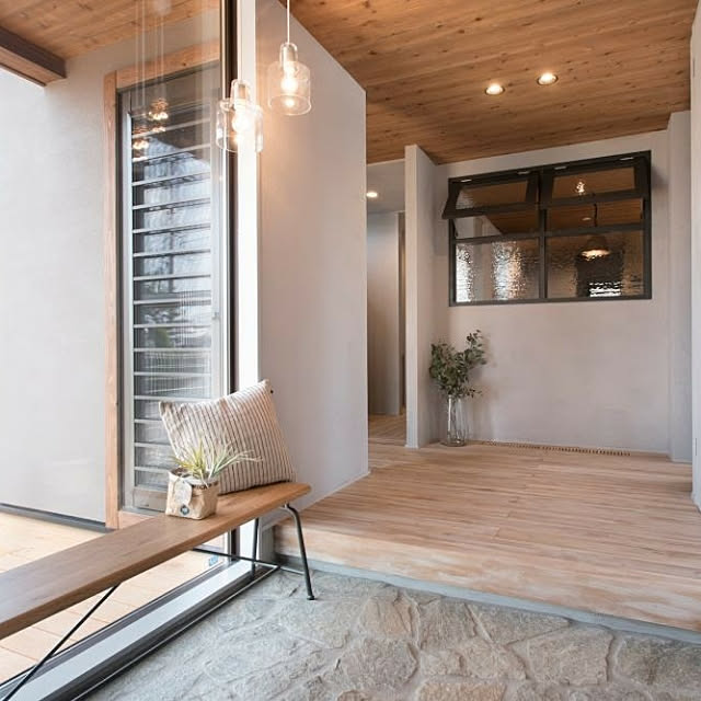 自然豊かな景観が魅力の長野県に暮らすbluestoneさんご一家のお住まいは、2階建て4LDKです。まずはじめに迎え入れてくれるのは、明るく開放的でbluestoneさんもお気に入りと言う玄関ホール。ウッドデッキを臨む大きな窓と洗練されたシンプルなインテリアが、より広々と高級感のある雰囲気を作り出しています。また、LDKの様子がほんのりと漏れる、ブラックアイアン+すりガラスの室内窓が、そっと温かみと向こう側への期待値を膨らませてくれるのも素敵です。