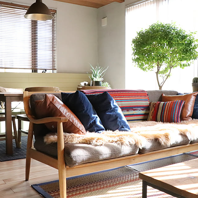 LDKへと移動すると、こちらも同様に開放感たっぷり。ネイティブアメリカンの要素を取り入れることで差し込まれた色彩たちの落ち着きのあるアクセントが利いた、スタイリッシュなヴィンテージナチュラルでまとめられています。レザーやデニム、ファー、木、アイアン……異素材が絶妙なバランスでコーディネートされていて、シンプルさの中にもしっかりと味わいが漂っています。
