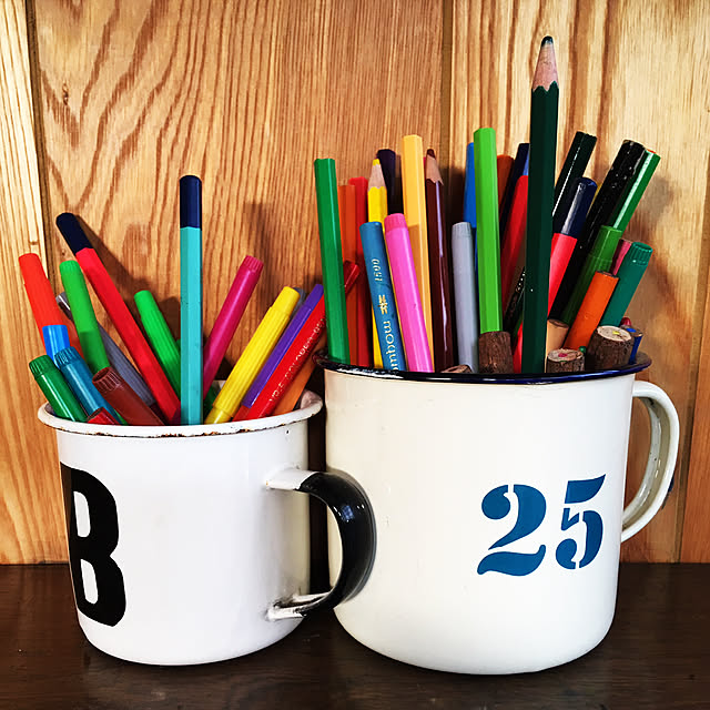 家の中でペンや鉛筆など、棒状のものを手に持ちながら歩くと、転倒したときに持っている子ども自身を傷つけることがあります。そのため、ペンや鉛筆は1本だけでなく、このように入れ物ごと持ち運ぶようにするとよいでしょう。ホーローのマグカップは持ちやすく割れる心配がないので、お子さんにも安心ですね。