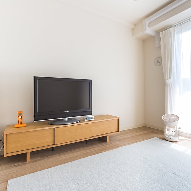 「引っ越して最初に購入した無印良品のAVラック。高さを抑えたデザインで、床に座った状態でテレビを観るのにちょうどよく、オーク材の素材感も部屋の雰囲気に馴染んでいます。」