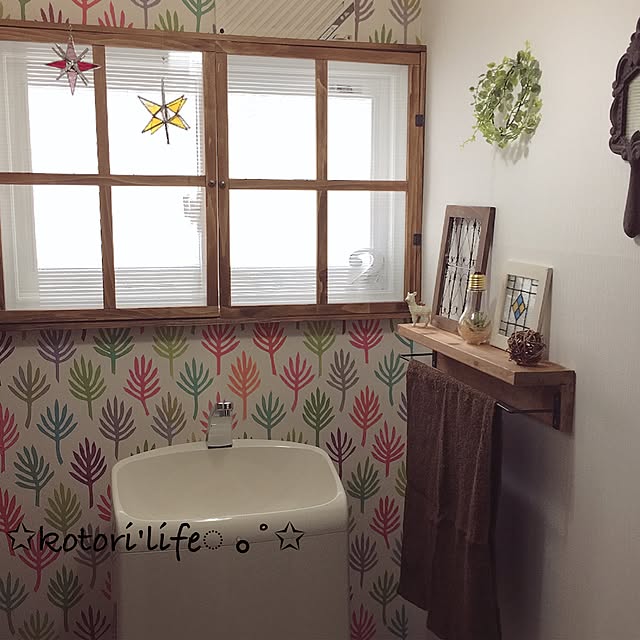 カラフルな壁紙に、素朴な雰囲気の木製インテリア。手作りのワイヤークラフトがかわいらしさ満点の、kotoriさんのトイレです。こちらの木の窓枠も、壁紙貼りもDIY!女の子が喜ぶ雰囲気ですね。