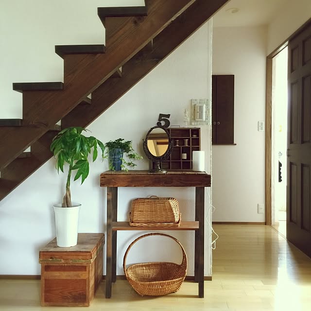 階段下の空間をメイクスペースにしているこちらのユーザーさん。家事などをしていてちょっと手が空いたときに、ここに立ち寄ってメイクをするということが可能ですね。身だしなみをチェックするのにも良さそうです。古い道具を使った味のあるコーナーは、ディスプレイとしても素敵です。