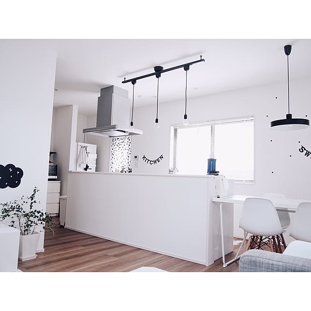 「色味を白黒グレーで統一させたインテリアにしているので、キッチンも同じ色味にしています♡アイランドキッチンにしたかったのですが、この間取りだとアイランドキッチンが大きすぎて取り入れられないことがわかり、悩んだところキッチン自体は標準のものを使い、ダクトのみをアイランド用にするという案にたどり着き、今のキッチンになりました。見た感じはアイランドキッチンですが、コストはダクトの差額のみだったので結果コストダウンにも繋がり良かったなと思っています♡キッチンやダイニングテーブルのカラーを全て白に。照明は黒にしたのもこだわりの1つです。」