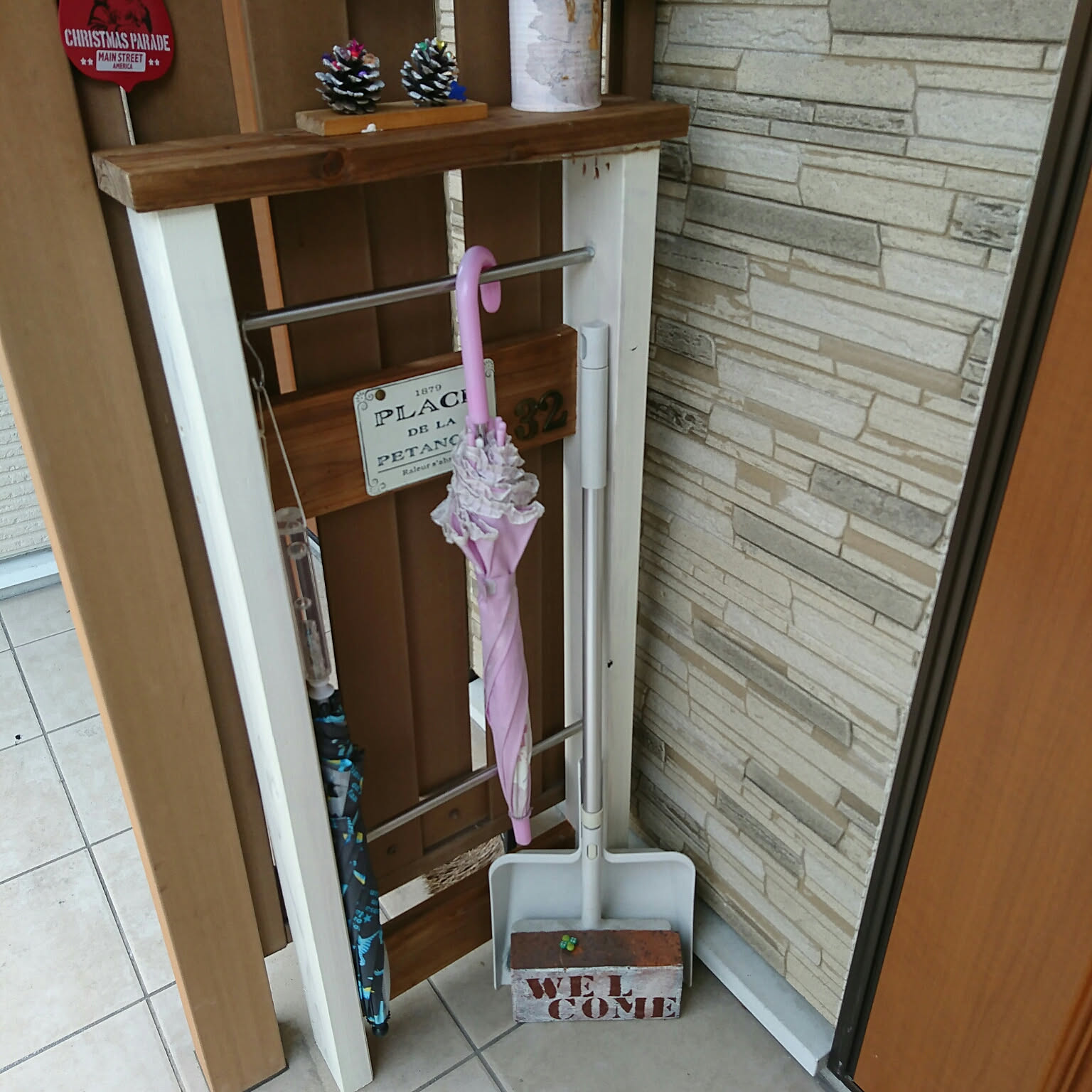 玄関入り口横に作りつけの傘立ては、とても便利そうです。パイプが通してあるので、フックを使えば折りたたみ傘や、お掃除の道具などもかけられます。上の棚にディスプレイができるのもいいですね。スリムだけど機能豊富なsena.masato.mamaさんのDIY、参考にしたいです。