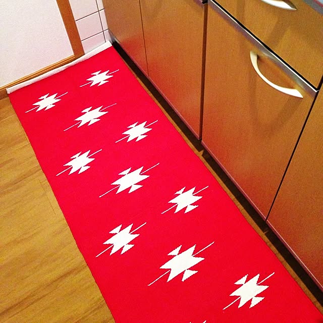 パワーを感じさせるアクティブな色といえば、レッド系が思い浮かびます。96yukaさんは、レッド系に白色のアクセントが入っているキッチンマットを活用。アクセントがあることで、より鮮やかでよりキレイに見え、メリハリのある空間になりますね。