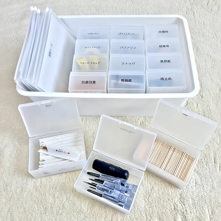 手に収まりの良い絶妙なサイズ感の四角いBOXは、日常生活においてそれだけで使い勝手の良いものです。そこへきて、中身が見やすい半透明、カチッと閉まるフタ、水にも熱にもある程度耐性がある無印良品のポリプロピレン救急用品ケースは、家庭の収納に最適と言っても過言ではなさそう。sumikoさんのように、スッキリとシンプルだけれど、家族みんなの使いやすさを大切にした暮らしづくりを目指すなら、是非チェックしておきたいアイテムです。収納を見直している最中、細々としたものがいつも行方不明になるのがストレス、分類したものの収納場所へ収まりが悪い!そんな皆様の救世主にきっとなってくれますよ。