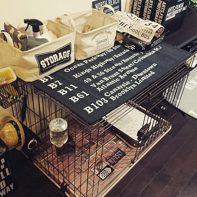 Rlovesyucaさんのワンちゃんのお家は、男前なブルックリンスタイル。レンガにキリっとブラックが効いたかっこよさが魅力です。ダイソーのストレージボックスには、ワンちゃんの小物を収納し、違和感なくなじんでいます。タイプの違う2種類を並べるのも、表情が変わっていいですね。