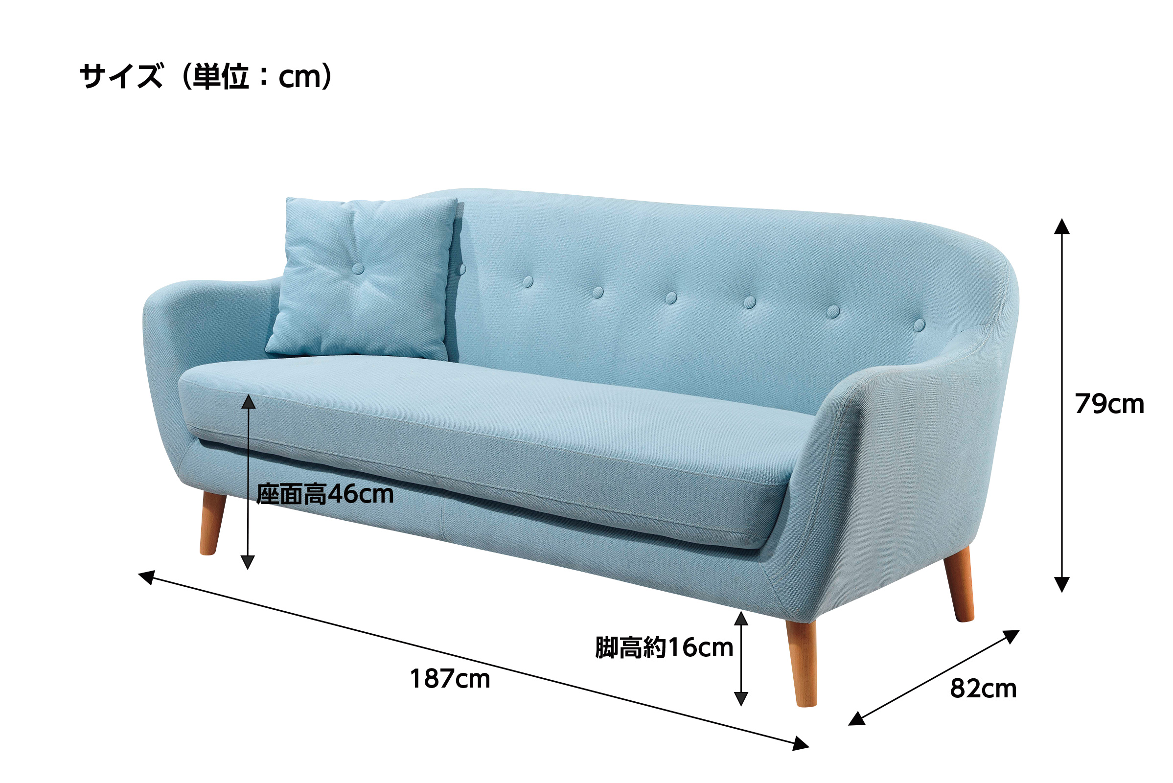 今までになかったライトブルー色で、置くだけでお部屋がパッと明るくなるソファ。脚はナチュラルな木の素材なので、カジュアルタイプのお部屋でもフェミニン系のお部屋でも合います。お掃除のしやすい脚付きタイプです。