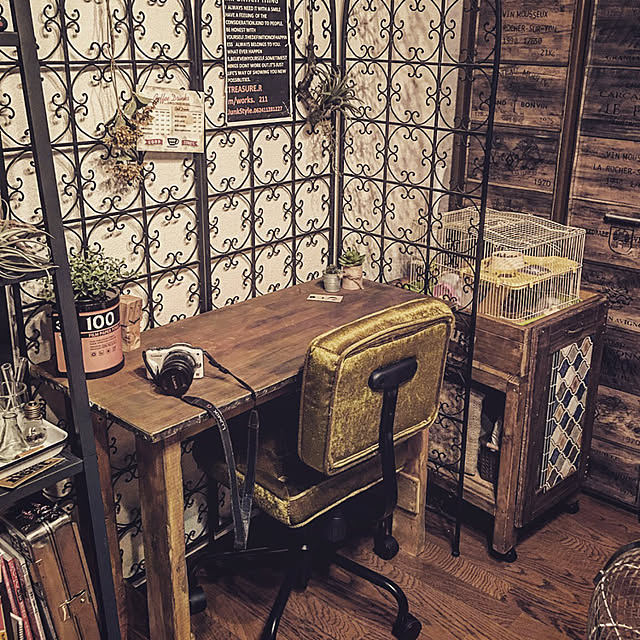 リビングの一角に設けられたデスク。こちらはユーザーさんがDIYしたものだそうです。古くからあるかのような、色合いがたまりませんね。味のあるレトロなチェアや、アイアンのパーテンションを組み合わせて、オリジナリティある雰囲気づくりをされています。こんなデスクなら、作業もリラックスしてできそうです。
