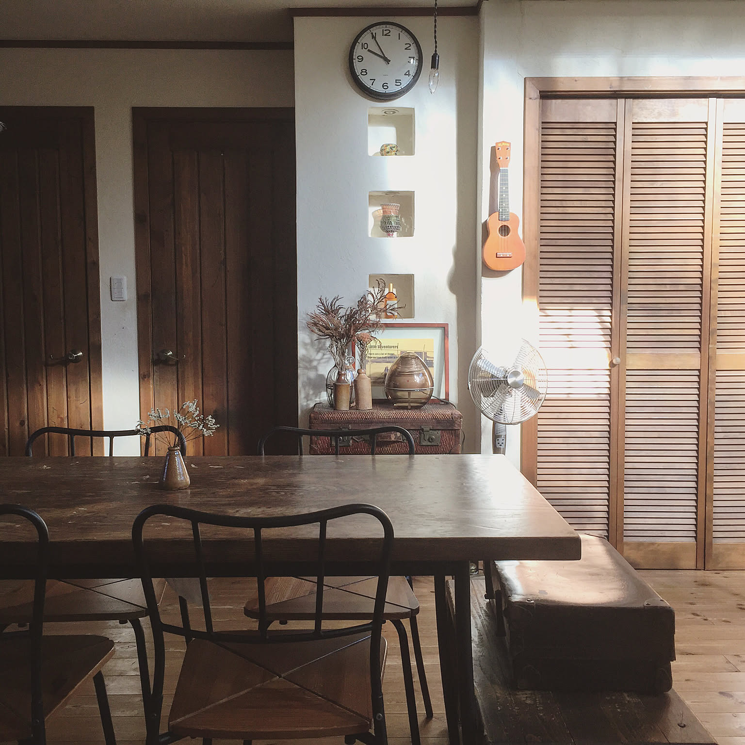 yururi-8239223さんのお部屋は、懐かしさの中におしゃれで温かい雰囲気があります。時計の下には3つのニッチがあり縦に並んでいるため、視線は自然と上がります。色味を抑えた小物がまとまりを生んでいます。ニッチの中を飾るだけでなく壁の前にあるものも含めて、壁一面がディスプレイになっています。