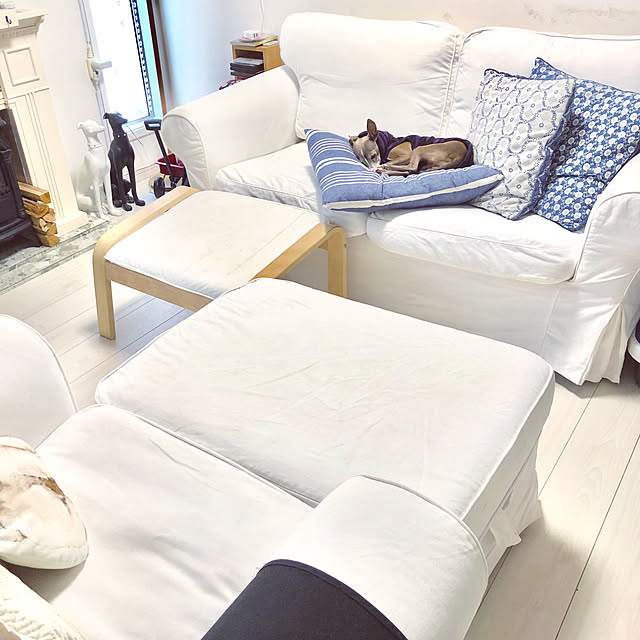 suzyさんのワンちゃんが気持ちよく眠る二人掛けのソファはエークトルプというシリーズ。柔らかみのあるフォルムと、憧れの真っ白カバーがたまりません。また、写真手前には同シリーズの一人掛け、スツールもあり、デザインをそろえることでよりクラッシックな雰囲気にまとめられています。