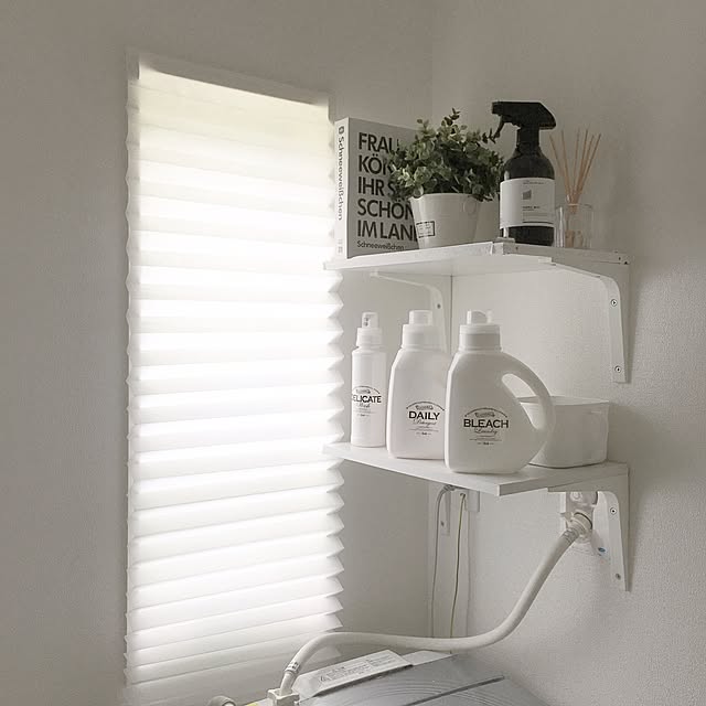 白いアイテムでまとめられた、清潔感あふれる洗面所。ユーザーさんはIKEAの白いプリーツブラインドを付けられています。プライバシーを守りつつ光を通してくれるので、洗面所など明るさを保ちたい場所の目隠しに最適です。