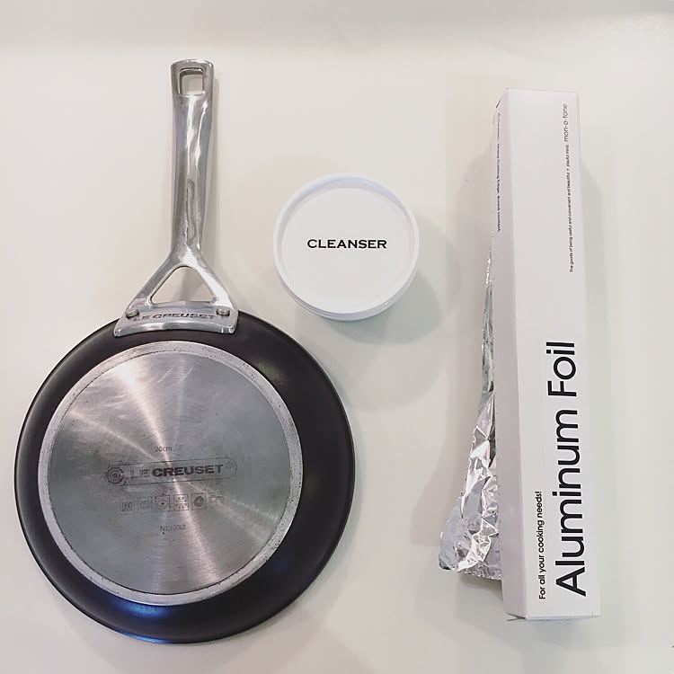 アルミホイルは、丸めるとたわしのように使うことができます。クレンザーとアルミホイルを使って磨いたというル・クルーゼのフライパンの裏は、焦げがあったとは信じられないほどピカピカですね。クレンザーやスチールたわしを使える素材のものであれば、アルミホイルでも代用できますよ。