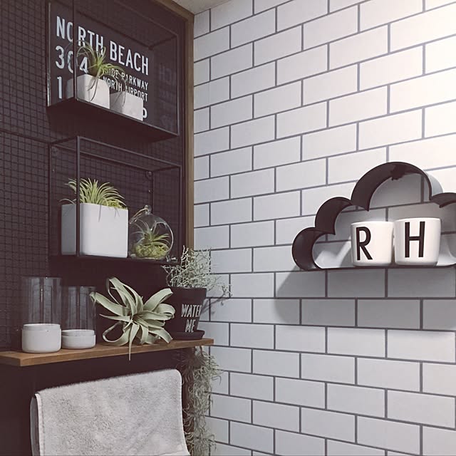 直線的なモノトーンのインテリアでまとめられた、RIONさん宅のバスルーム。レンガ風の壁にかけられたブラックの雲シェルフが、まるで現代アートのように見えてしまうほどスタイリッシュです。こんなバスルームならキレイに使いたくなりますね。