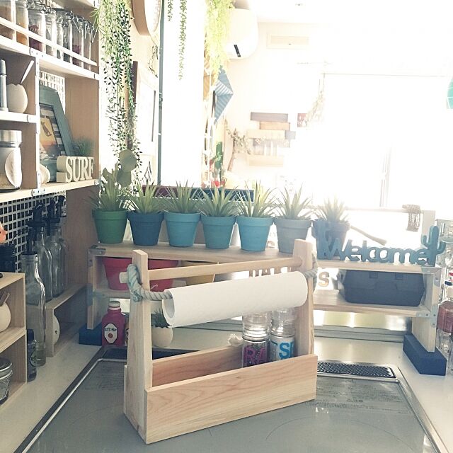 こちらのユーザーさんは、すのこDIYで作ったスパイスラックにキッチンペーパーホルダーをプラス。調理小物や調味料もここにまとめることができるので、実に使いやすそうです。さりげなくグリーンが飾られていて、すのこの木の質感と白のキッチンペーパーをなじませるポイントになっています。