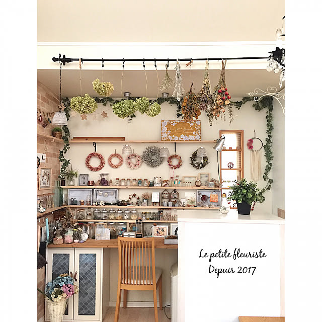 見ているだけでワクワクしてしまう♪ たくさんのドライフラワー。ユーザーさんのアトリエスペースだそうです。カーテンレールを取り付け、壁にはスワッグなどを吊るしてリースがたくさん飾られています。1つだけでもおしゃれですが、たくさん飾るとお部屋の主役になり、お店のようです♡