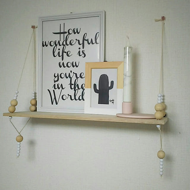 ウッドビーズを通した紐を吊って壁にかけたハンギングシェルフ。ウッドビーズがあるとないとでは、ずいぶんと印象が変わるのではないでしょうか。ちいさなウッドビーズを下に垂らすようにつけたり、細かい部分まで考えられています。...t_m_eee...さんも、木の柔らかい感じがお気に入りだそうですよ♡