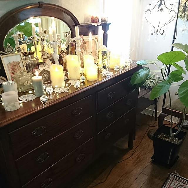 kimiさんは、リビングのチェストにさまざまなキャンドルを集めてディスプレイしています。重厚感があり、少しクラッシックなチェストが、ライトアップされたキャンドルを一層美しく見せてくれます。灯りを付けていないときも様になる飾り方で、見せる収納にもなっているそうです。真似してみたいですね。
