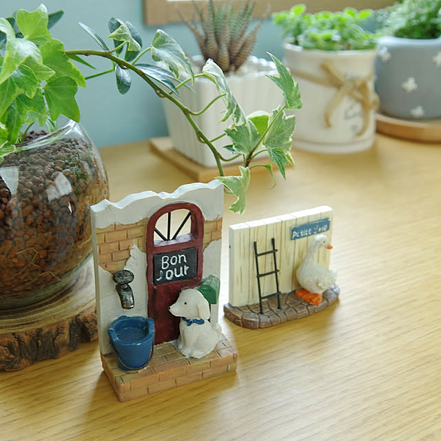 こちらは、レンガや壁の細部にまでこだわった、美しいデザインのミニチュア雑貨です。動物の表情や仕草にも、癒されますね。ユーザーさんのようにグリーンとともに飾ると、よりインテリア性が高まります。他にも、猫ちゃんがいたそうです。