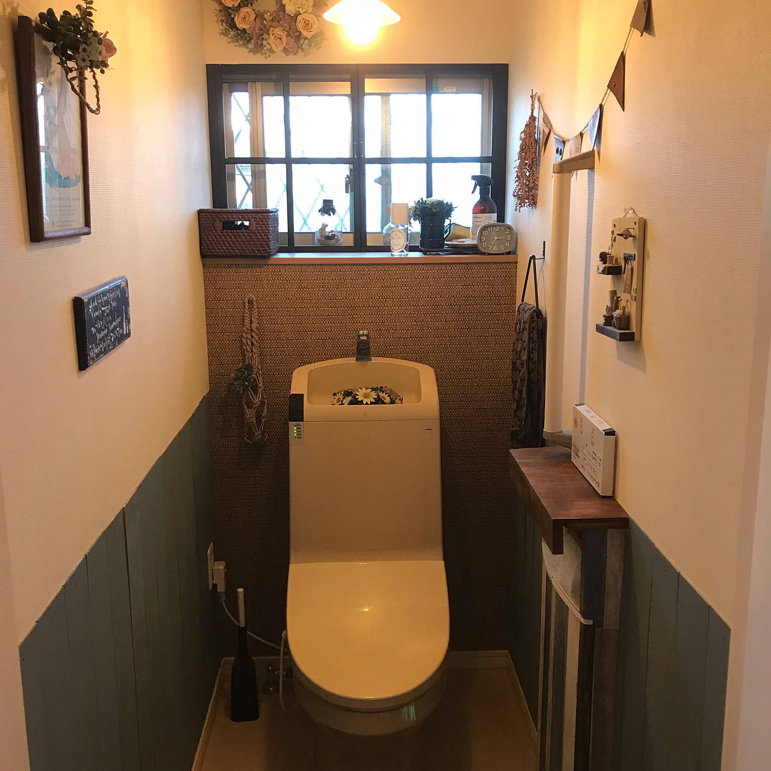 こちらのユーザーさんは、カフェ風雑貨をディスプレイした、ナチュラルインテリアのトイレ空間を実現しています。トイレの背面のアクセントクロスや、腰壁の色使いもベーシックなカラーで、落ち着きのある、くつろげるインテリアになっていますね。ナチュラルインテリアは、色使いもポイントです。