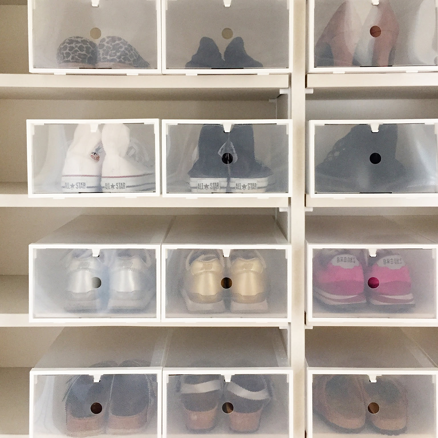 靴をまるでお洋服をしまうかのように収納されていたのは、yuka.homeさんです。使用されているのは、クローゼットボックスのように見えるクリアなシューズボックスです。すっきりまとまるだけでなく、ボックスが透明なので中身が一目でわかりやすいのもいいですね。