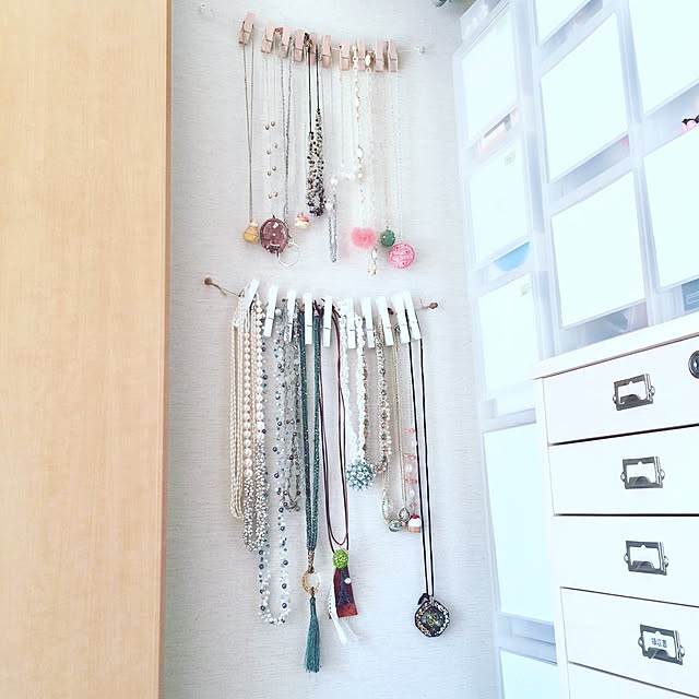 こちらのユーザーさんは、100均のウッドクリップを紐に通して、ピンで壁に留めたアクセサリー収納を作っています。ウッドクリップがネックレスの間にあるので、からまらずに見やすくまとまっていますね。洋服とコーディネートするときにも、選びやすそうです。
