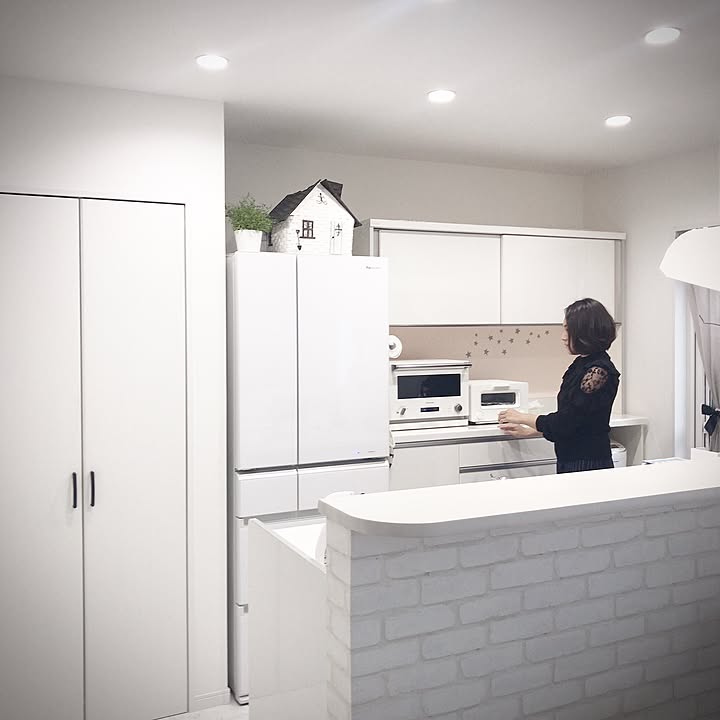 「最近ずっと欲しかったバルミューダを購入しました!お気に入りの家電に囲まれてうれしいです♡ますますキッチンが好きになりました!冷蔵庫の上にはエコクラフトで作ったお家の収納箱。普段使わない運動会用のお弁当箱類が入ってます。“丘の上のおうち“のようでお気に入りです♡」