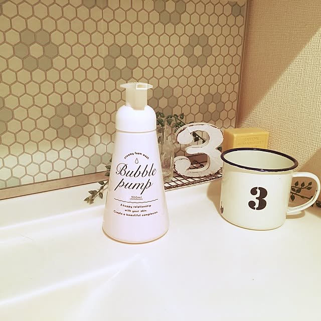 キャンドゥのソープボトルは泡タイプ対応で、こんなにオシャレ♪ユーザーさんのナチュラルな洗面所にもよく似合っています。末広がりで安定感のある形が、滑りやすい水まわりでも使いやすそうですね。