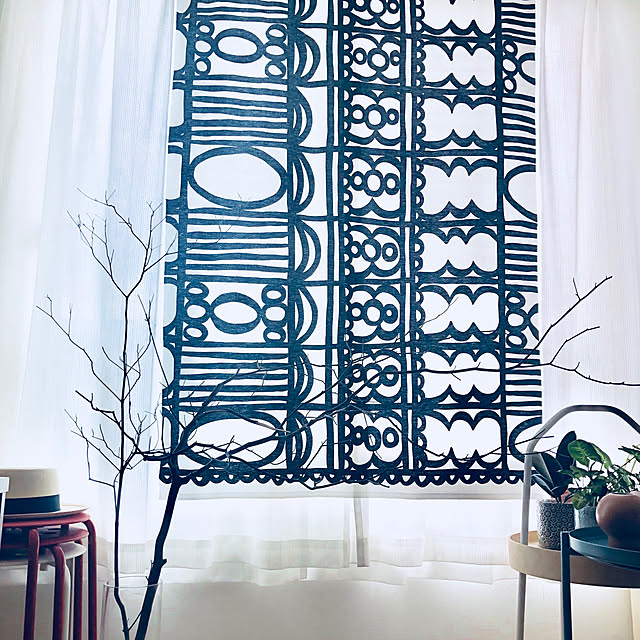 YYさんは、テキスタイルを素敵なアイデアでカーテンに使われています。レースのカーテンに、タペストリーのように重ね付け。カーテンを開けなくても陽射しが感じられ、逆に日よけ効果もありそうですね。斬新な柄でレビュー評価の高い、REVVIVA を使用されています。