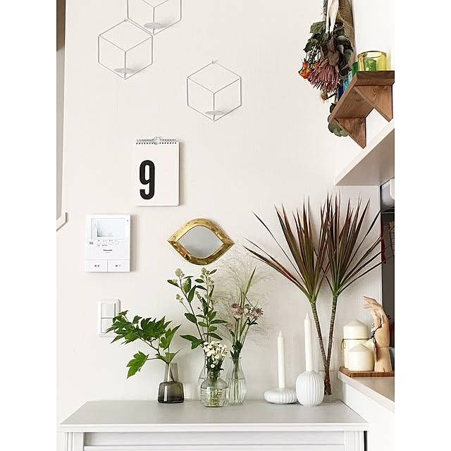 大きさの異なるIKEAのブロックキャンドルと、木製のハンドトルソーを合わせて、モダンな雰囲気のディスプレイに工夫されています。シンプルな白いキャンドルでも、高さを変えたものを並べることで、立体感のあるディスプレイになりますね。白で統一されたキャンドルが、すっきりとしたアクセントになっています。