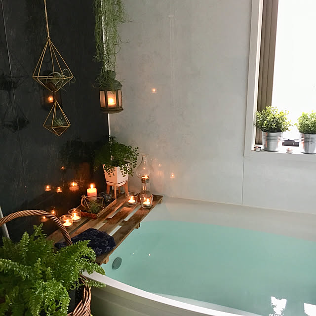 極上のリラックスタイムに導いてくれそうなリッチなkan2さんのバスルームです。こんな風にキャンドルをたくさん灯せば、まるでホテルのスパのような、リラックス空間になりますね。黒い壁に映り込んだキャンドルの灯りがロマンティックな雰囲気を出しています。