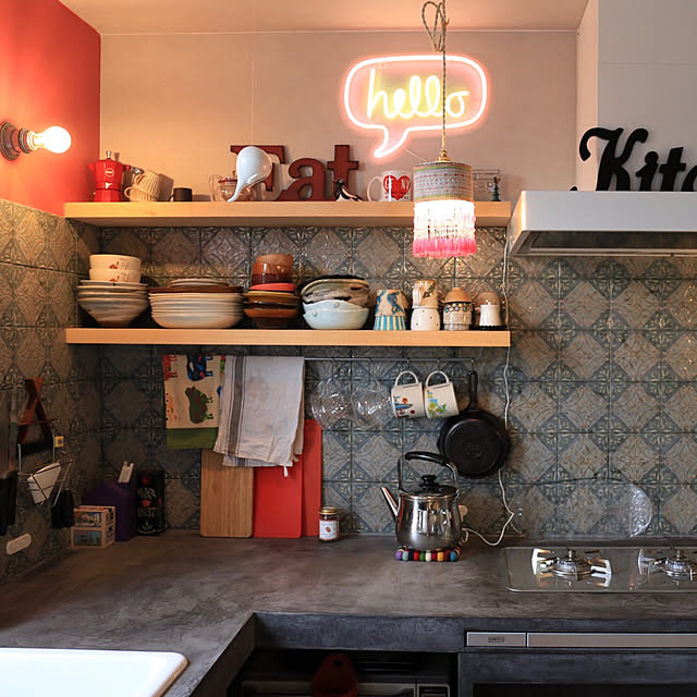 キッチン壁の棚に、食器を収納している実例です。後片付けや食事の準備も、スムーズにできそうですね。ムーディなライトを取り付けると、海外のダイニングカフェのようです。