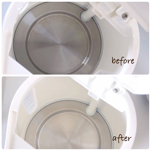 ケトル内部の汚れは、水の中に含まれるカルシウムやマグネシウムが蓄積されたものです。そんなアルカリ性の汚れは、クエン酸で落とすことができますよ。peecoさんは、クエン酸と水をケトルで沸かして1~2時間ほど放置し、その後きれいな水を沸かしたそうです。ケトル内が、新品のようにピカピカになっていますね。