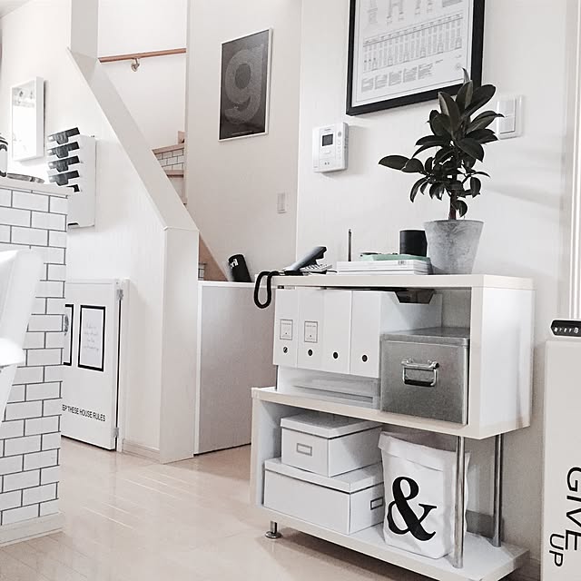 こちらはサブウェイタイル風の壁紙やユニークな棚をバランスよく取り入れていらっしゃるモノトーンインテリアです。いろいろな形の収納ボックスのなかに、トタンボックスを置くことで単調に感じないディスプレイに仕上がっています。白が多めのモノトーンスタイルにスパイスとして加えるのも素敵です。
