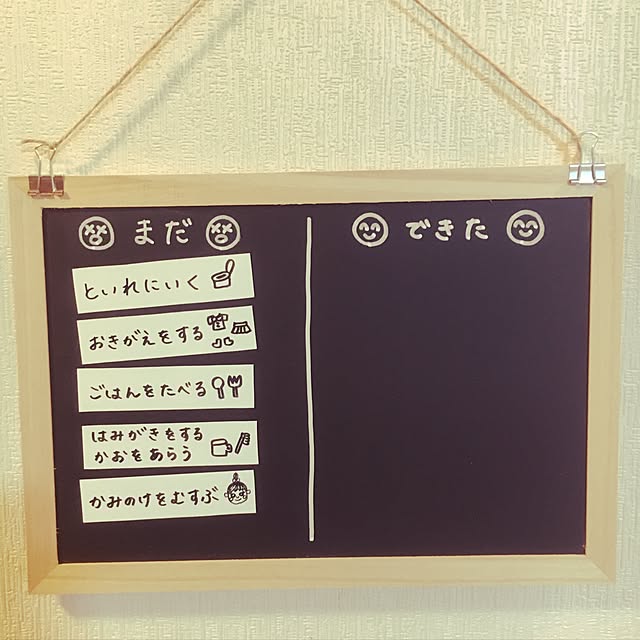 朝やるべきことをボードにして、支度をルーチン化するアイデアです。上から順番にやっていくと、準備がすべて終わるという流れになっています。文字とイラスト入りで分かりやすく、やり終わったら右側に移すので達成感も味わえそうです。