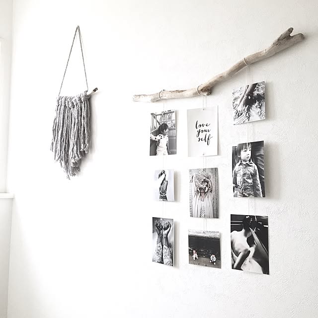 流木は、どのお家にもあるアイテムと組み合わせて飾っても存在感のあるディスプレイになるんです。ruicoさんは、流木と写真を組み合わせてタペストリーを作っていましたよ。流木の、年月を重ねた奥行きのある雰囲気にモノクロ写真が趣を添えてくれています。