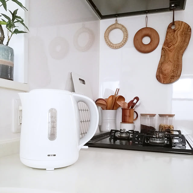 こちらは、コロンとしたフォルムの白いケトルです。白と木の素材で統一している北欧風なキッチンに、お似合いのデザインです。大容量の1.2リットル、空炊き防止機能、沸騰後自動オフなど、機能が充実な上に洗練されたデザイン、と言うことなしですよ♪