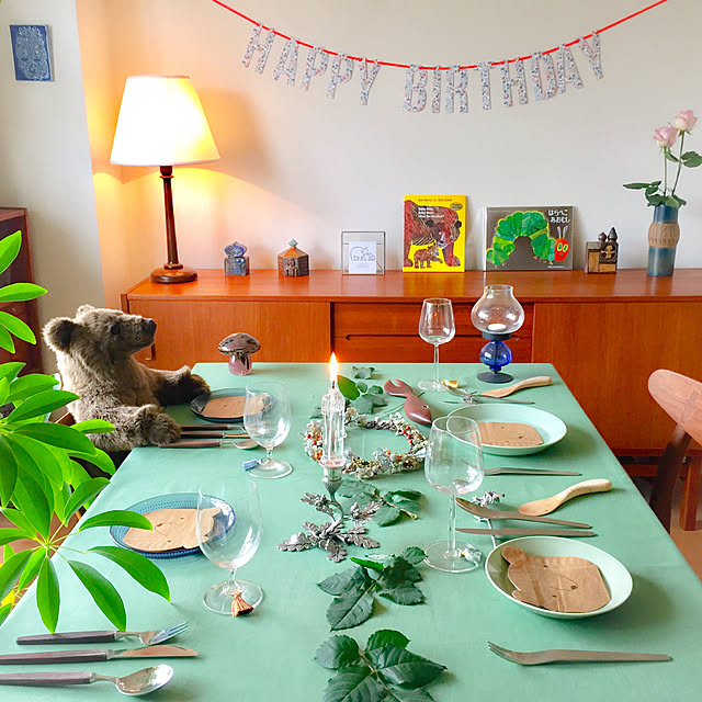 「くま」をテーマにしたというテーブルセッティングは、まるで絵本の中をのぞいているかのようですね。遊び心が感じられるコーディネートである一方、厳選された雑貨はどれも洗練されていて大人の余裕が感じられます。ぜひ特別な日にはこのように物語性を意識して、お部屋を飾ってみてはいかがでしょうか。