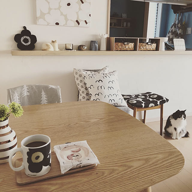 北欧柄のファブリックを取り入れているsumosarozaさんのお家。いろいろな柄がありますが、どれも黒やグレーなどの落ち着いた色味をチョイスしていることで、とても上品で落ち着きのあるインテリアに仕上がっていますね。大きめの花柄などは、こんなコーディネートで上手にまとめられそうです◎
