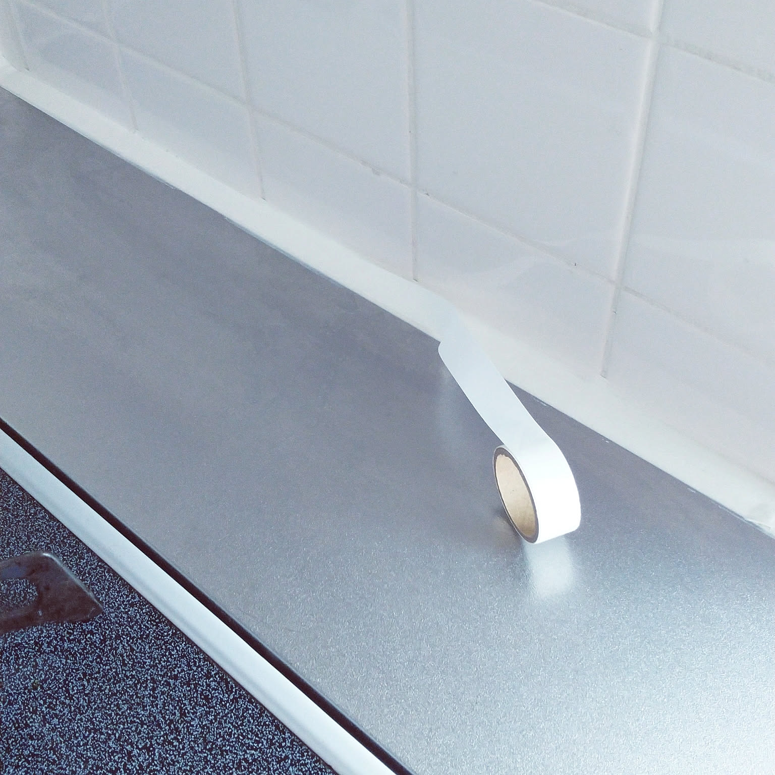 油汚れなどが付きやすい、キッチンのコーキング。ユーザーさんはマスキングテープを貼って、コーキングに汚れがこびりつくのを防いでいます。掃除は、マスキングテープを貼り替えるだけと簡単。白い無地のマスキングテープなので、壁に同化してなじんでいます。