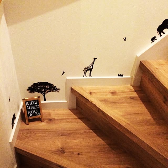 階段の高さに合わせて、アニマルのステッカーを貼られているwasacoさん。段を上がるごとに別の動物が見えて、お子さんも動物と一緒に喜んで登れそうですね♪シンプルな白い壁が、楽しい雰囲気に一変しています。