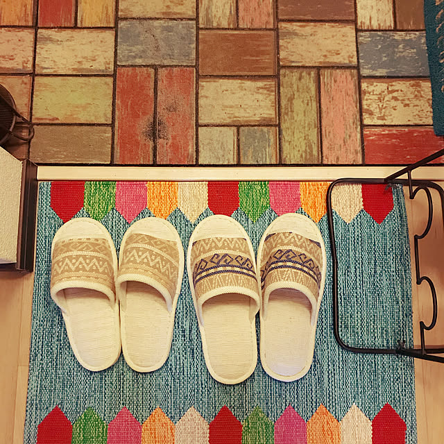 カラフルな玄関マットに似合う、ナチュラルカラーのスリッパ2柄。kurokoさんがチョイスされたスリッパは、生成りに同系色の幾何学模様がさりげなくオシャレです。オーソドックスなフォルムで深くスッポリと足に馴染み、フットワークも軽やかです♡