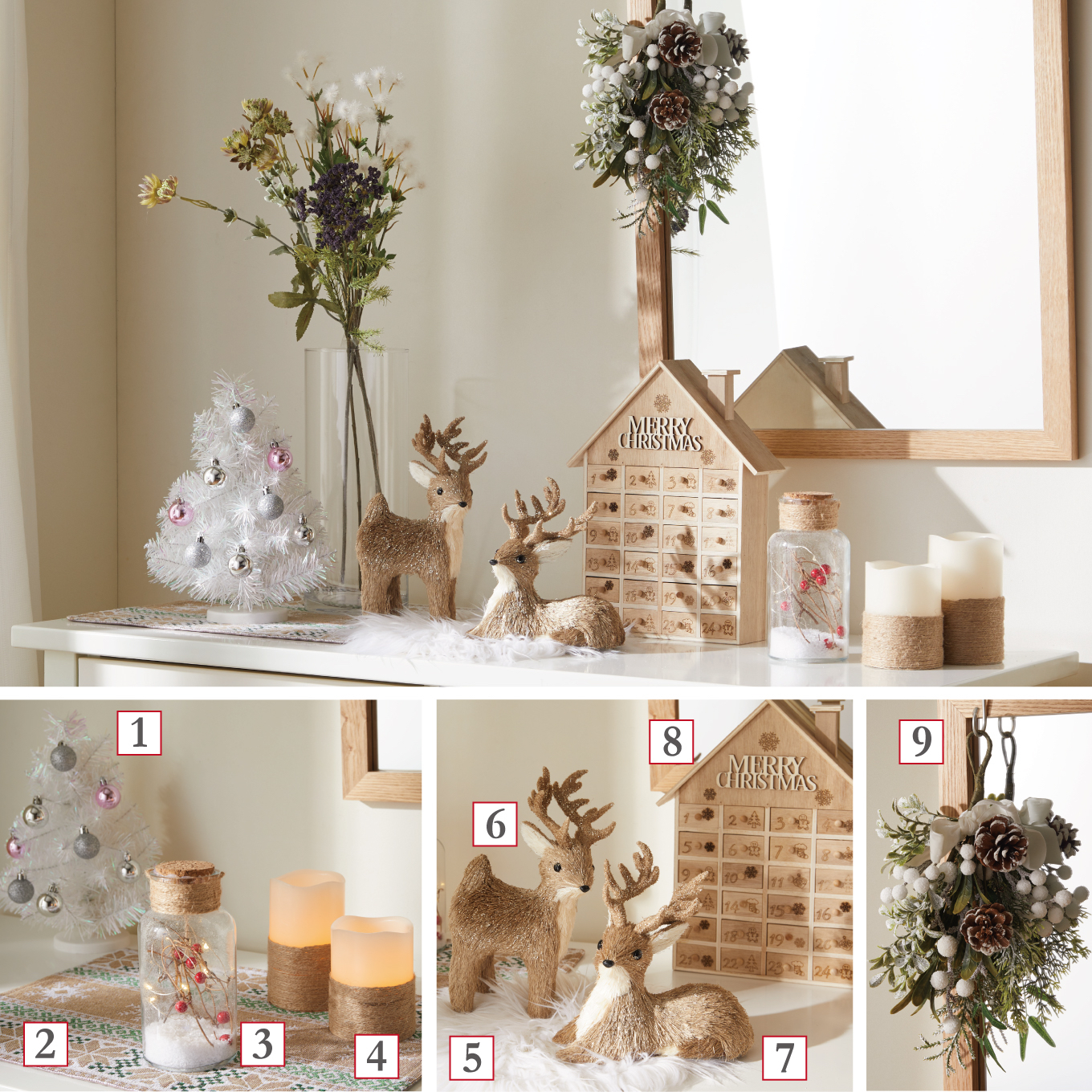 クリスマスの飾りつけは好きだけど、あまりクリスマス色が強すぎるとインテリアが子供っぽくなるような気がして……という方にもオススメのコースがこちら。ハーバリウム風のLEDライトやスワッグなど、ナチュラルな素材と色づかいのアイテムで、玄関やサイドボードの上などにさりげなく飾りつけをしてみましょう。アドベントカレンダーも飾って、子供のころのようにクリスマスまでを指折り数える楽しさも味わってみてくださいね。