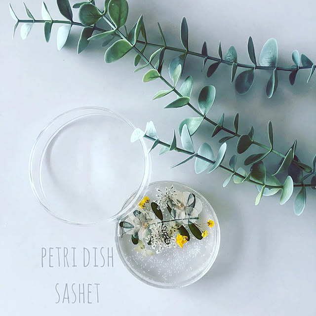 透明感たっぷりの、ジェルタイプのアロマシャーレを手作りしたlovesspongebobさん。クリアなシャーレを使用しているので、蓋をしていても美しさを楽しめるそうですよ。イエローの花がフレッシュさをより引き立てている、癒やし効果バツグンのアイテムです。