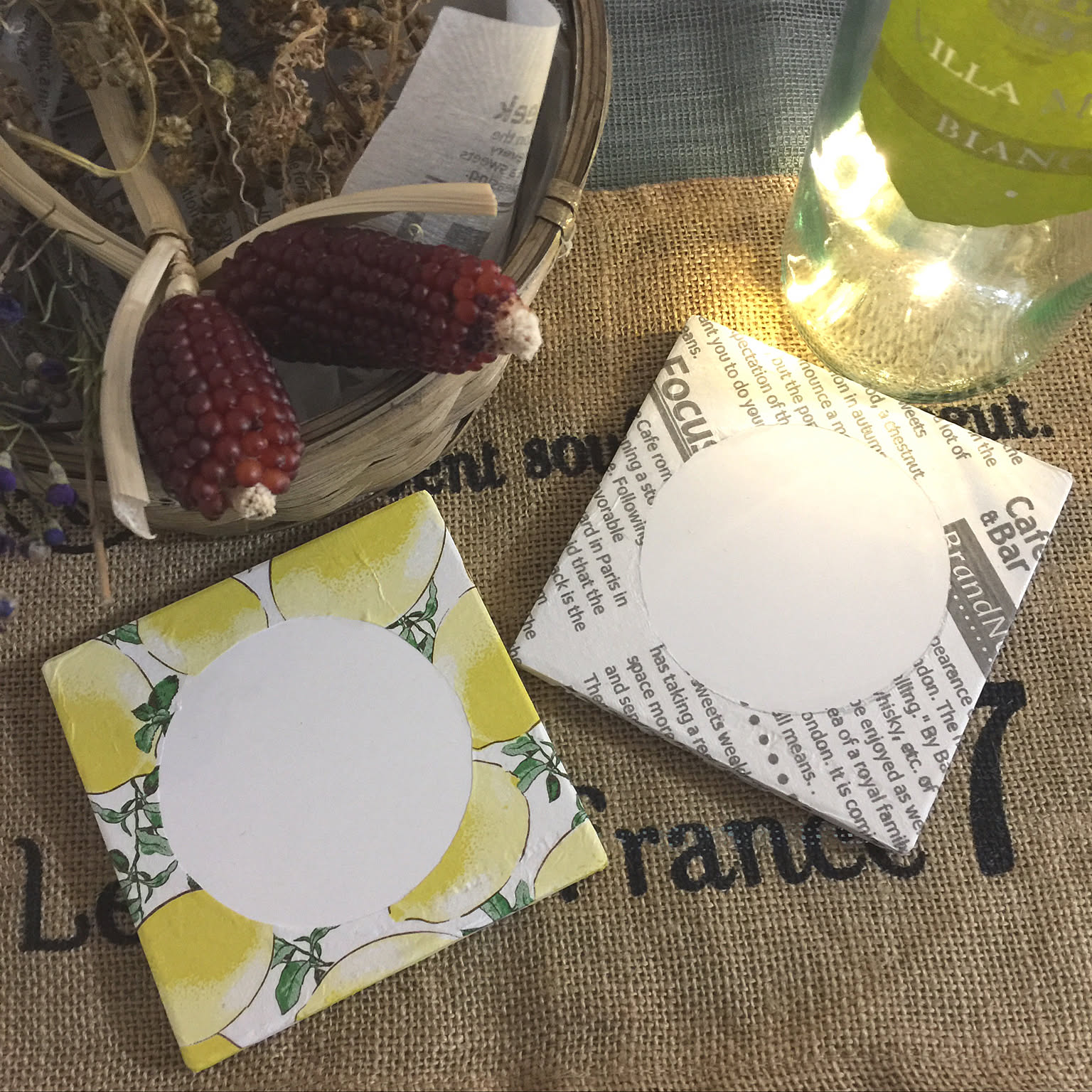 吸水コースターは、シンプルなものが多いですよね。そこで、機能性はキープしつつ簡単に柄を付けられる方法として、デコパージュをしていました。コップを置く真ん中だけ切り取ってから、貼り付けているんだそうです。キュートさが加わり、これを使えばテーブルもパッと明るくなりますね。