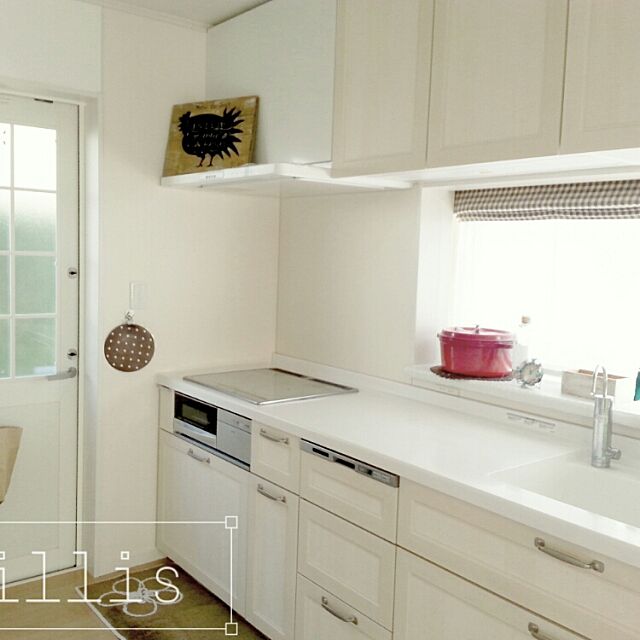 kiki_nekkoさん宅では、シルバーと白を基調としたキッチンのアクセントとして、赤いテーブルウェアを置いていらしゃいましたよ。赤いアイテムが1つ入ることで、クールな印象のキッチンに明るく温かい雰囲気がプラスされますね。