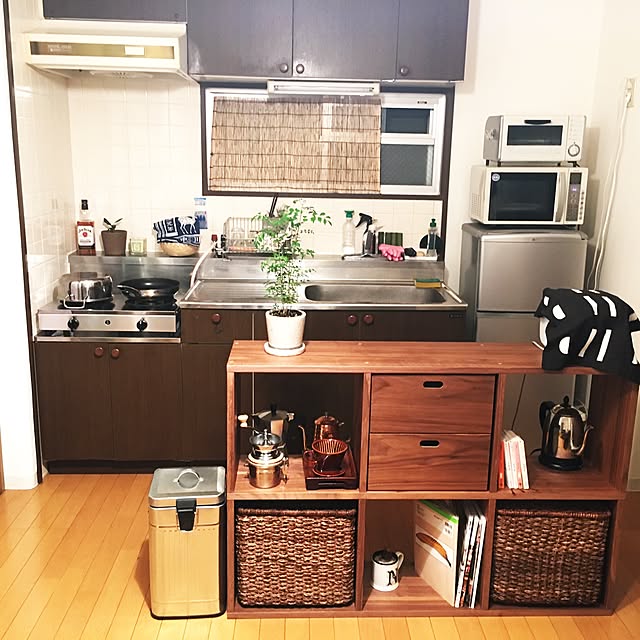 こちらのユーザーさんは2×3のスタッキングシェルフをキッチンとダイニングエリアの仕切りにつかっています。低さがちょうどいいので、空間の広々した印象を遮ることなく、上手にお部屋を仕切れていますね。バスケットや引き出しをつかい収納も確保しています☆