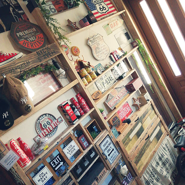 玄関サイドに、ディスプレイ棚をDIYされたcocoaさん。アメリカンな雑貨をたくさんディスプレイされています。壁一面に作られた棚は、迫力たっぷり。扉を付けて隠す部分をプラスされたところにも注目です。