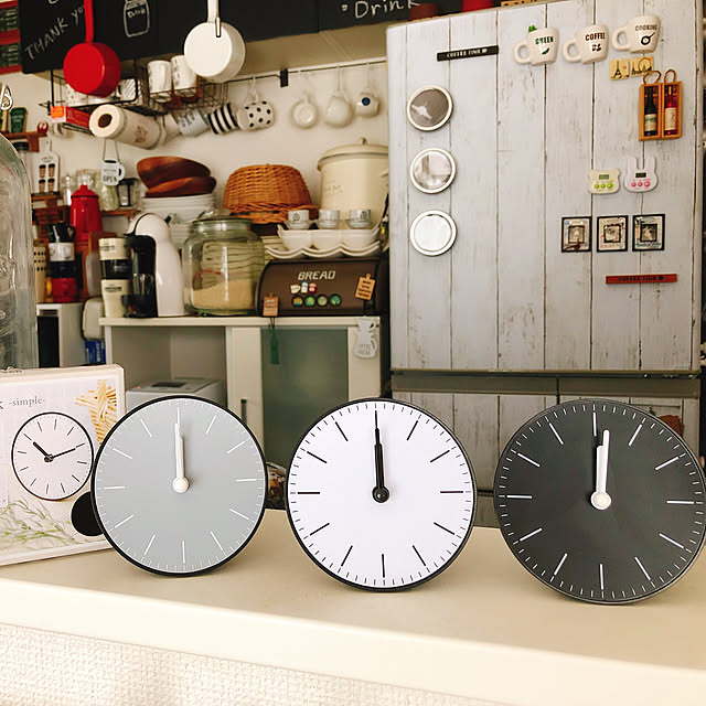 各エリアにあると便利な時計を、セリアで購入されたeriharuさん。こちらはなんと、置き時計としても壁掛け時計としても使えるそう。場所を選ばずに配置することができますね。どんなスタイルにもフィットしてくれるシンプルなデザインはちょうど良いサイズ感で、インテリアに馴染んでくれるモノトーンで展開中。